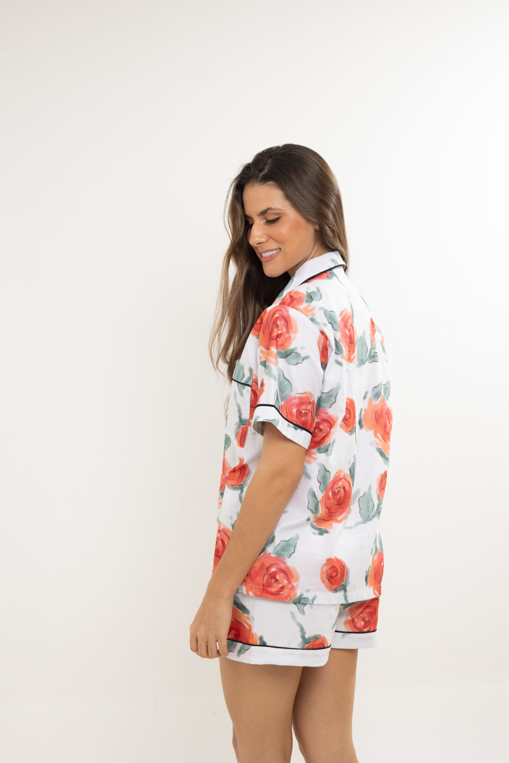 PIJAMA ELABORADA EN TELA 100% DE ALGODÓN ESTAMPADO EN ROSAS ROJAS TIPO ACUARELA. INCLUYE CAMISA MANGA CORTA CON BOLSILLO/ SHORT DE CINTURA AJUSTABLE CON CORDONES.