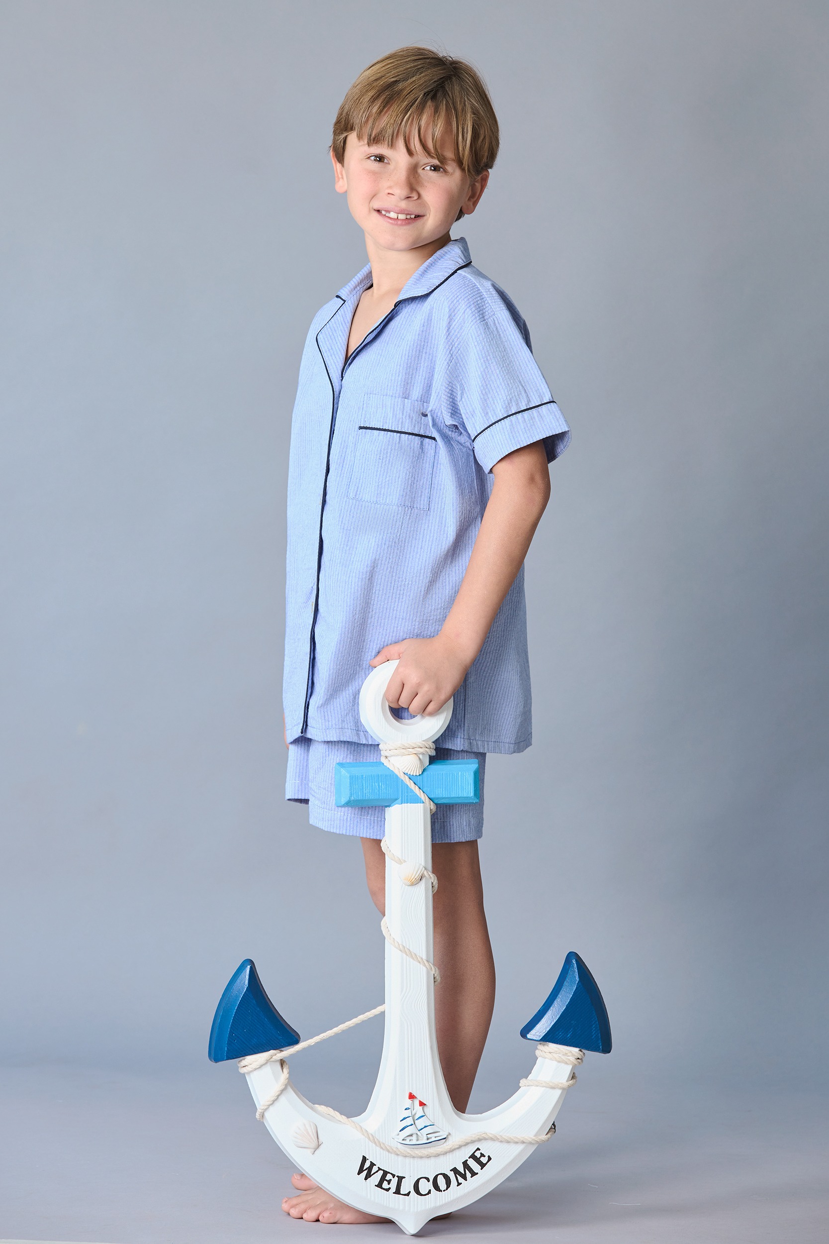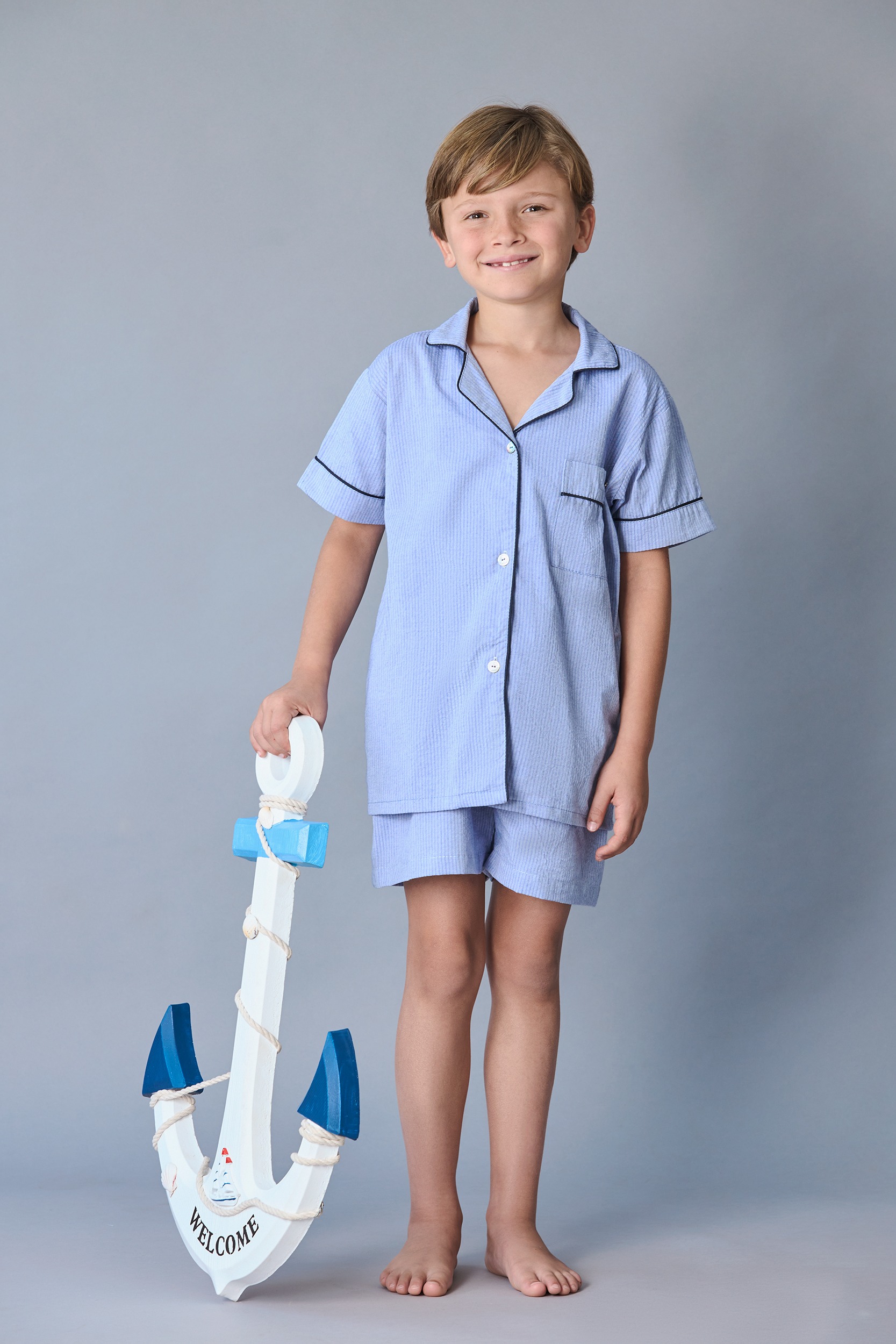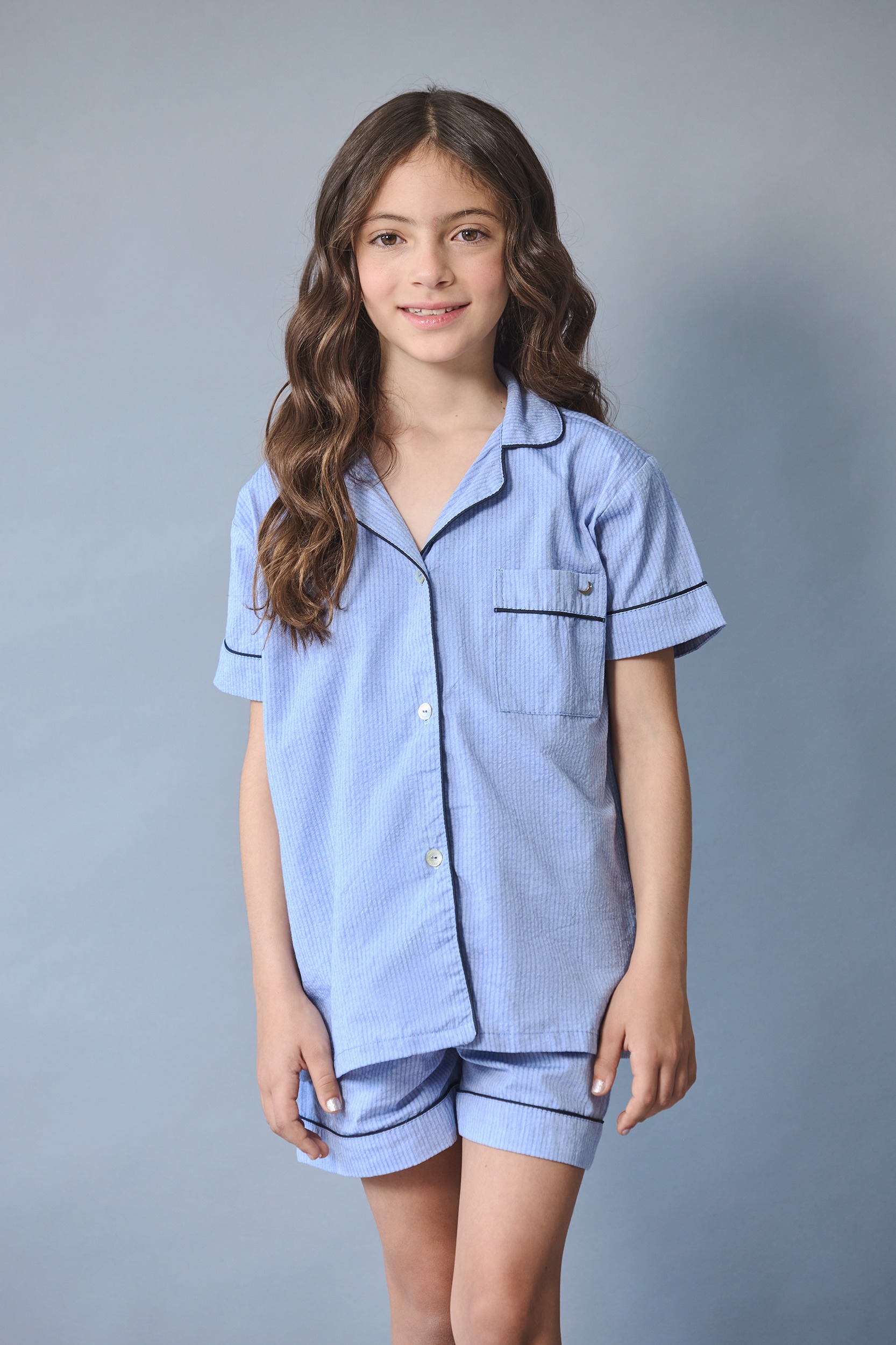 PIJAMA ELABORADA EN TELA 100% ALGODÓN DE TEXTURA CORRUGADA TIPO WAFFLE COLOR AZUL DENIM.