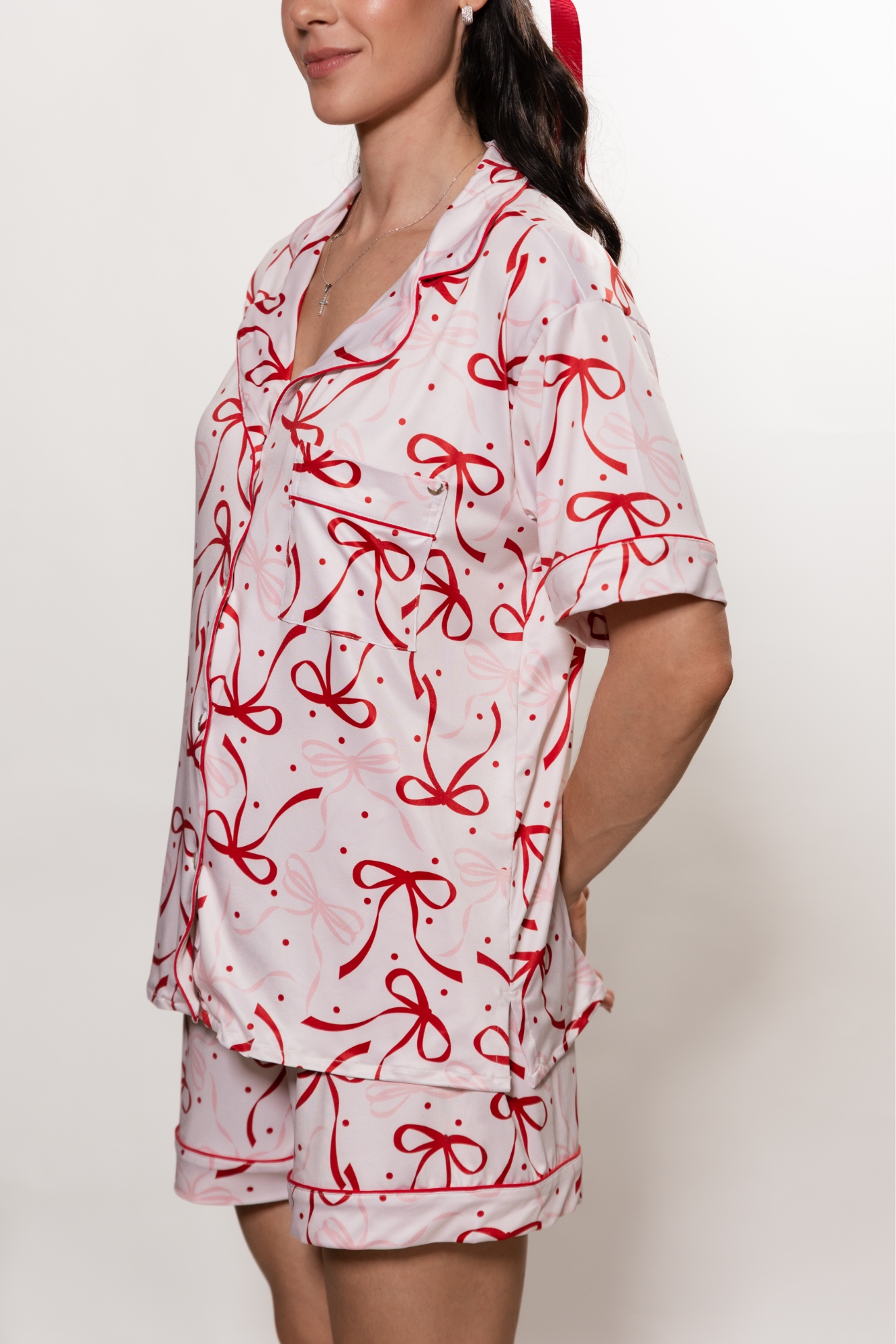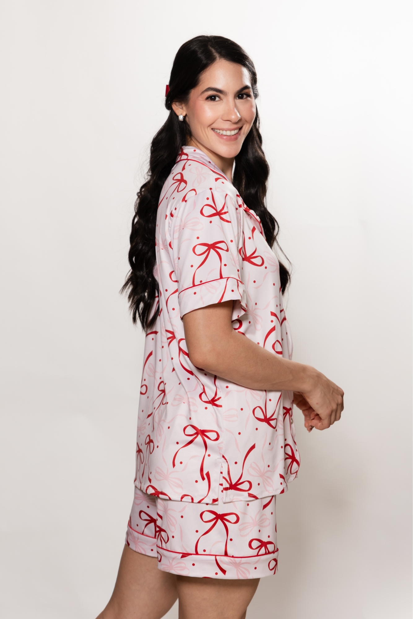 Nuestra pijama LACE es un sueño hecho realidad. Con un estampado de lazos rojos y rosados en un tejido de punto suave y elástico, esta prenda es perfecta para relajarte y sentirte como una princesa. Ideal para divertirse con amigas, mamá e hija, en holidays o cualquier época del año.