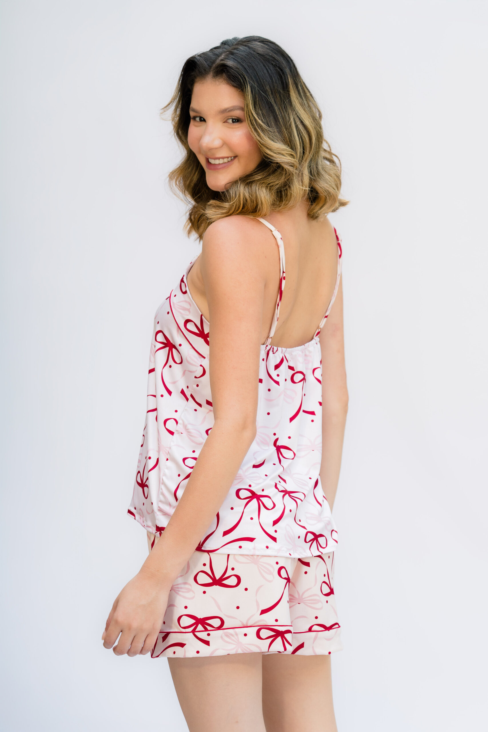 Nuestra pijama LACE es un sueño hecho realidad. Con un estampado de lazos rojos y rosados en un tejido de punto suave y elástico, esta prenda es perfecta para relajarte y sentirte como una princesa. Ideal para divertirse con amigas, mamá e hija, en holidays o cualquier época del año.
