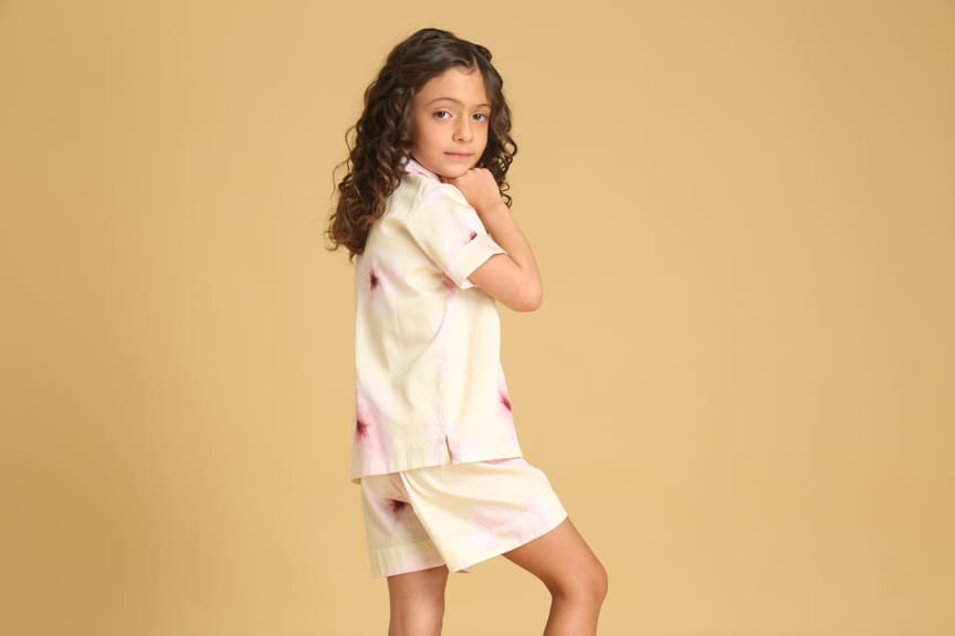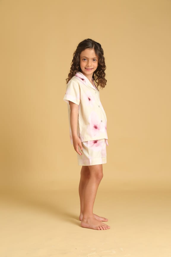 Pijama elaborada en tejido plano 100% algodón estampado en fondo vainilla con flores de tonos rodados. camisa de corte recto con manga corta, cuello con solapa y bolsillo del lado izquierdo. prenda inferior con elástico en la parte trasera de la cintura y ajustable al frente con cordones elaborados en la misma tela.