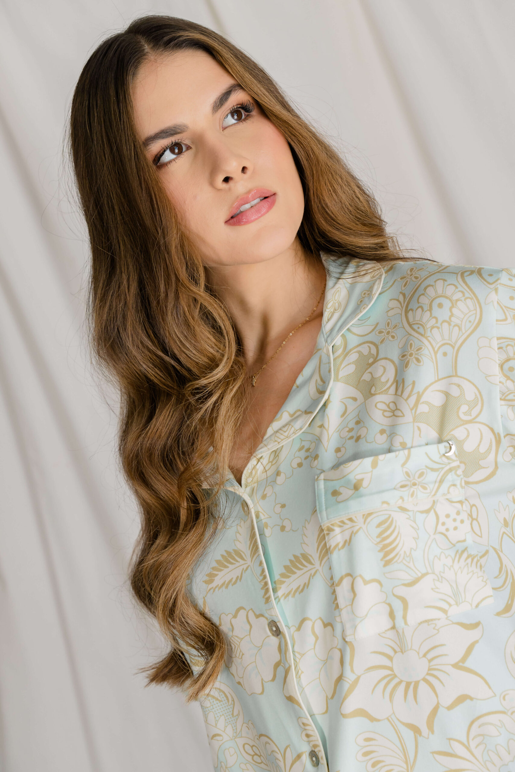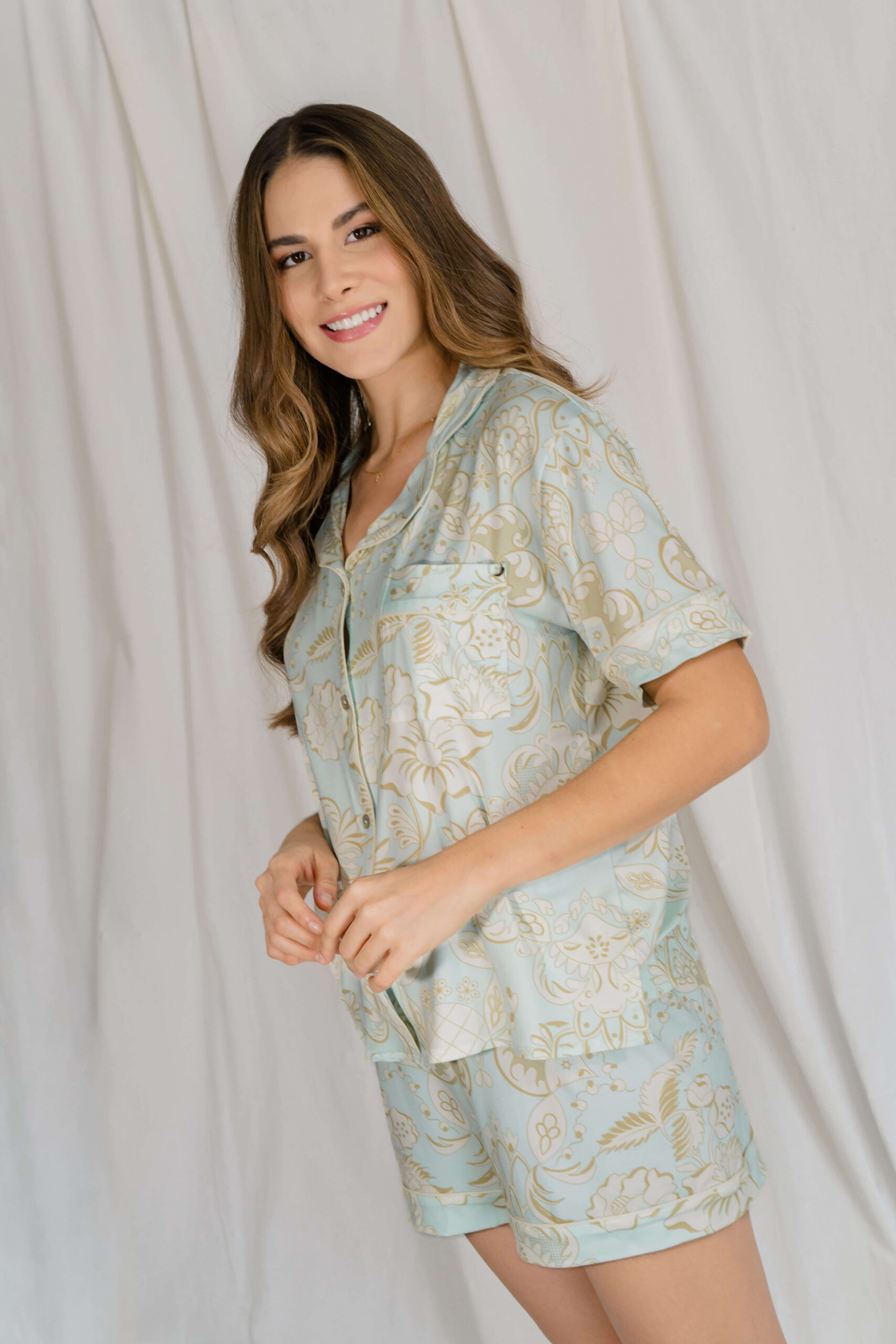 Set de dos piezas con camisa de manga corta y short, diseñado para ofrecer comodidad y estilo en tus momentos de descanso. Su estampado elegante en tonos suaves aporta un toque sofisticado y femenino.