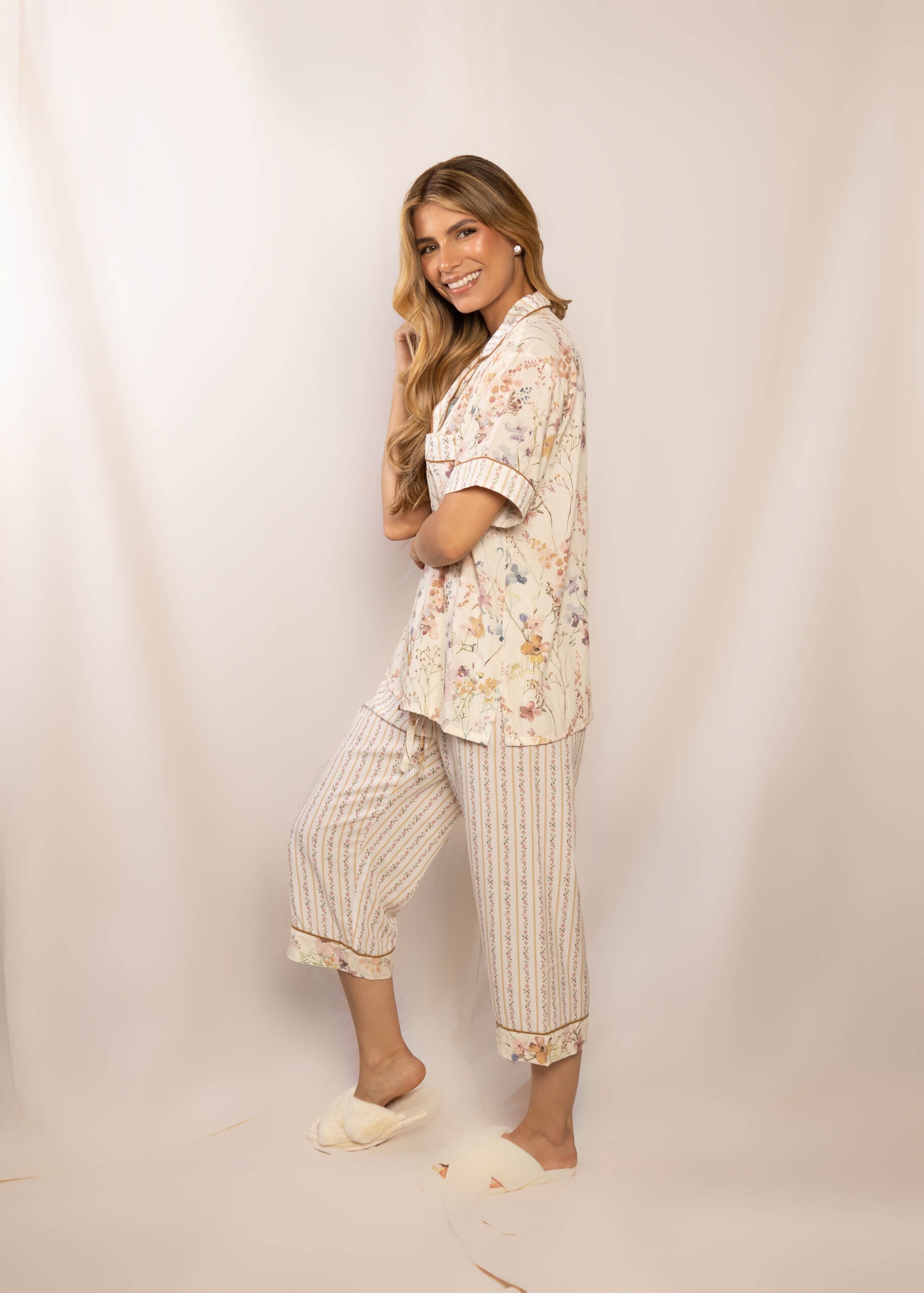 PIJAMA ELABORADA EN TELA DE VISCOSA 100% NATURAL, CON DELICADOS ESTAMPADOS FLORALES COMBINADOS QUE LA HACEN EXCLUSIVA Y ÚNICA EN SU DISEÑO. LA FLUIDEZ Y FRESCURA DE LA VISCOSA (RAYÓN) ES PERFECTA PARA UN DESCANSO PROFUNDO Y PLACENTERO, ESE QUE TODA MUJER MERECE TENER.