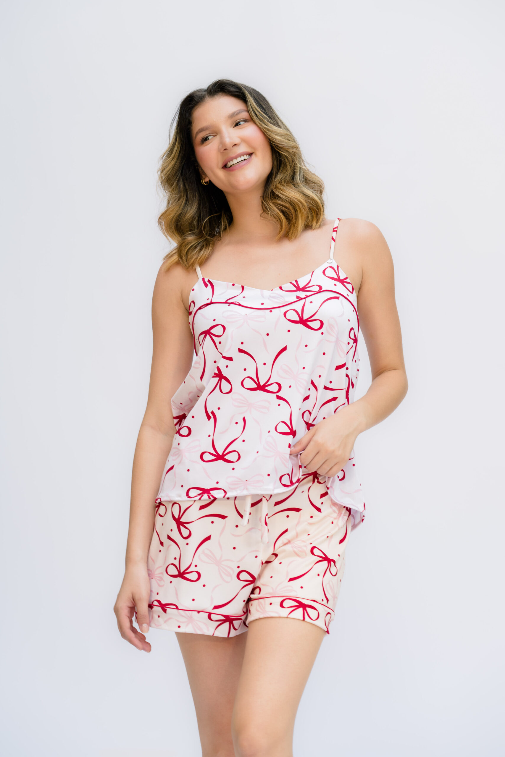 Nuestra pijama LACE es un sueño hecho realidad. Con un estampado de lazos rojos y rosados en un tejido de punto suave y elástico, esta prenda es perfecta para relajarte y sentirte como una princesa. Ideal para divertirse con amigas, mamá e hija, en holidays o cualquier época del año.