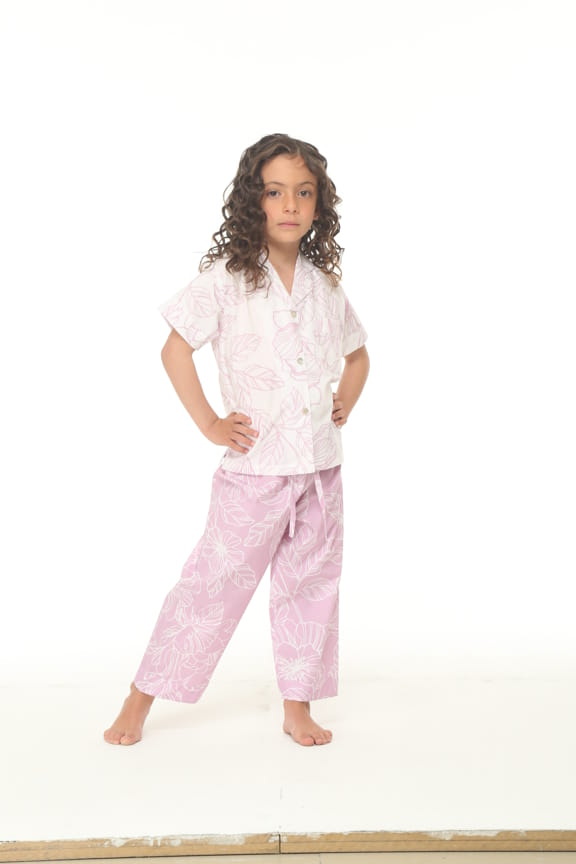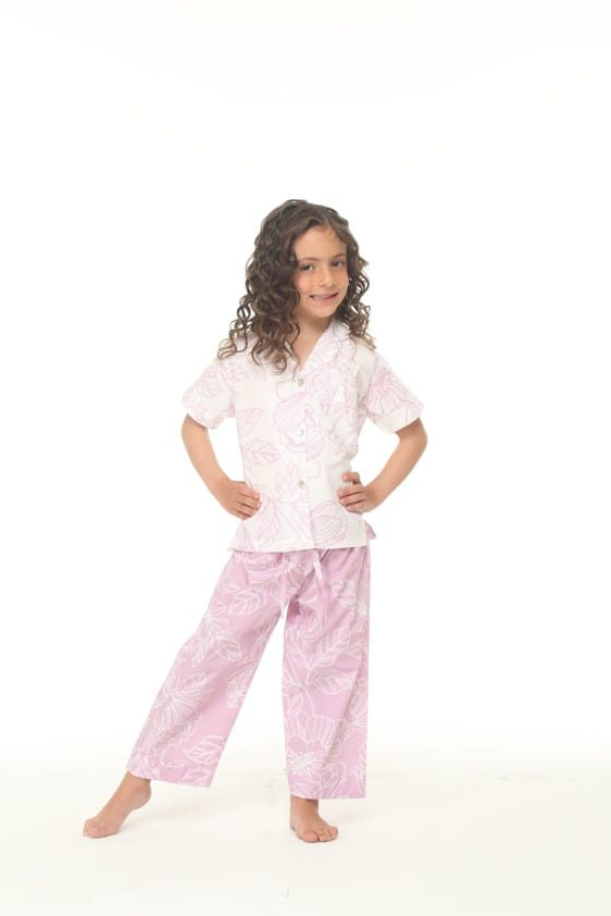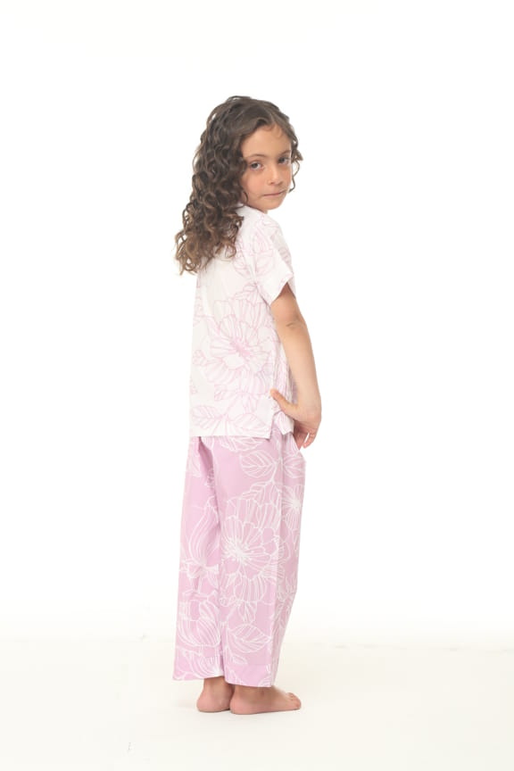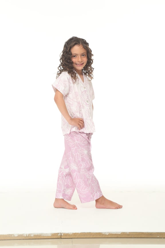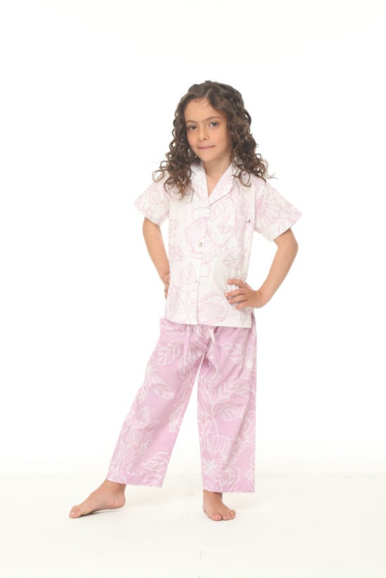Pijama elaborada en tejido plano 100% algodón, camisa en fondo blanco estampado con flores de color lila, manga corta, cuello con solapa, doble bolsillo en el frente y corte con prense en la espalda. prenda inferior en fondo color lila estampado con flores blancas, elástico en la parte trasera de la cintura y ajustable al frente con cordones elaborados en la misma tela.