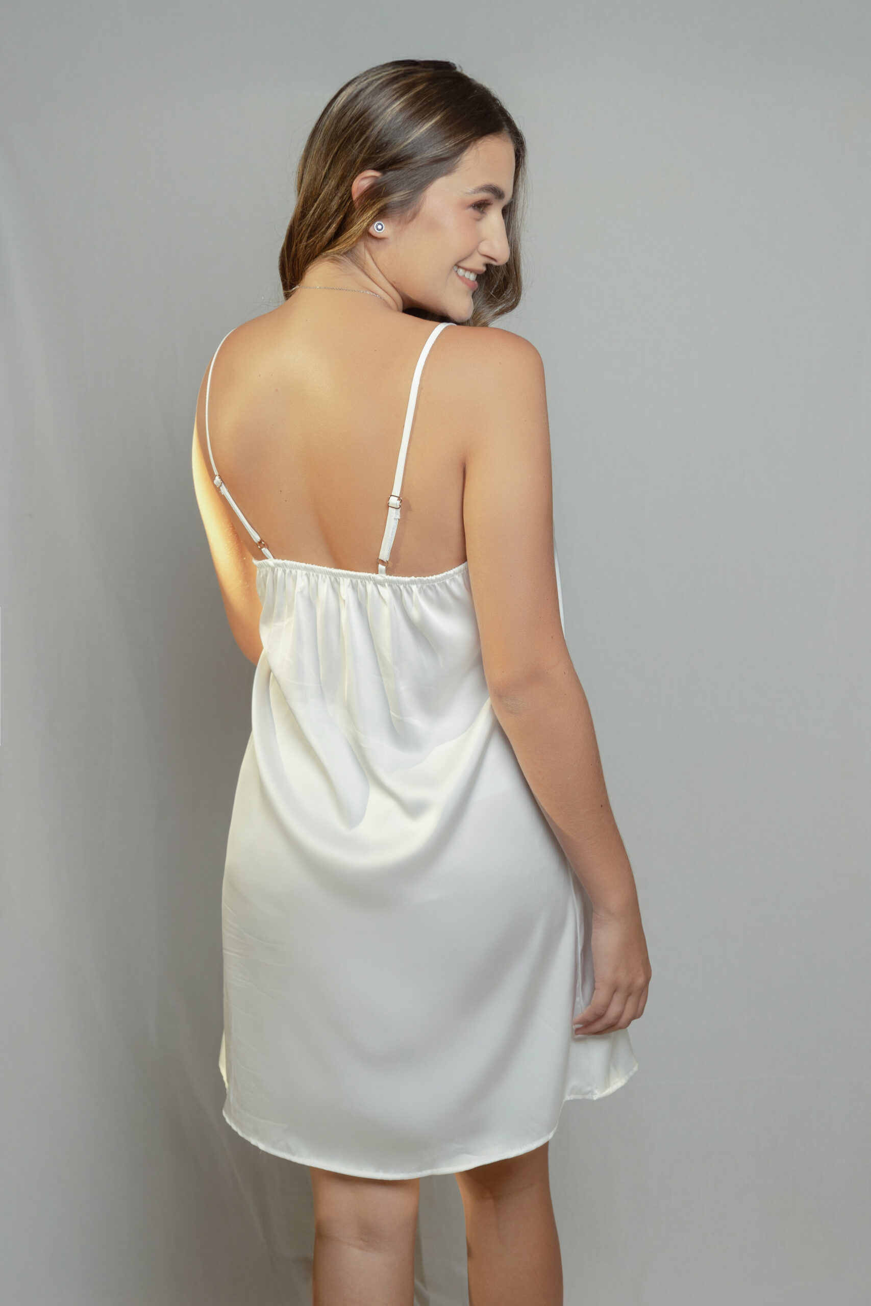 Bata de tirantas elaborada en tela tipo seda color blanco perla con delicado detalle en encaje, ideal para esas noches románticas o la tan esperada noche pre-boda que toda mujer sueña.