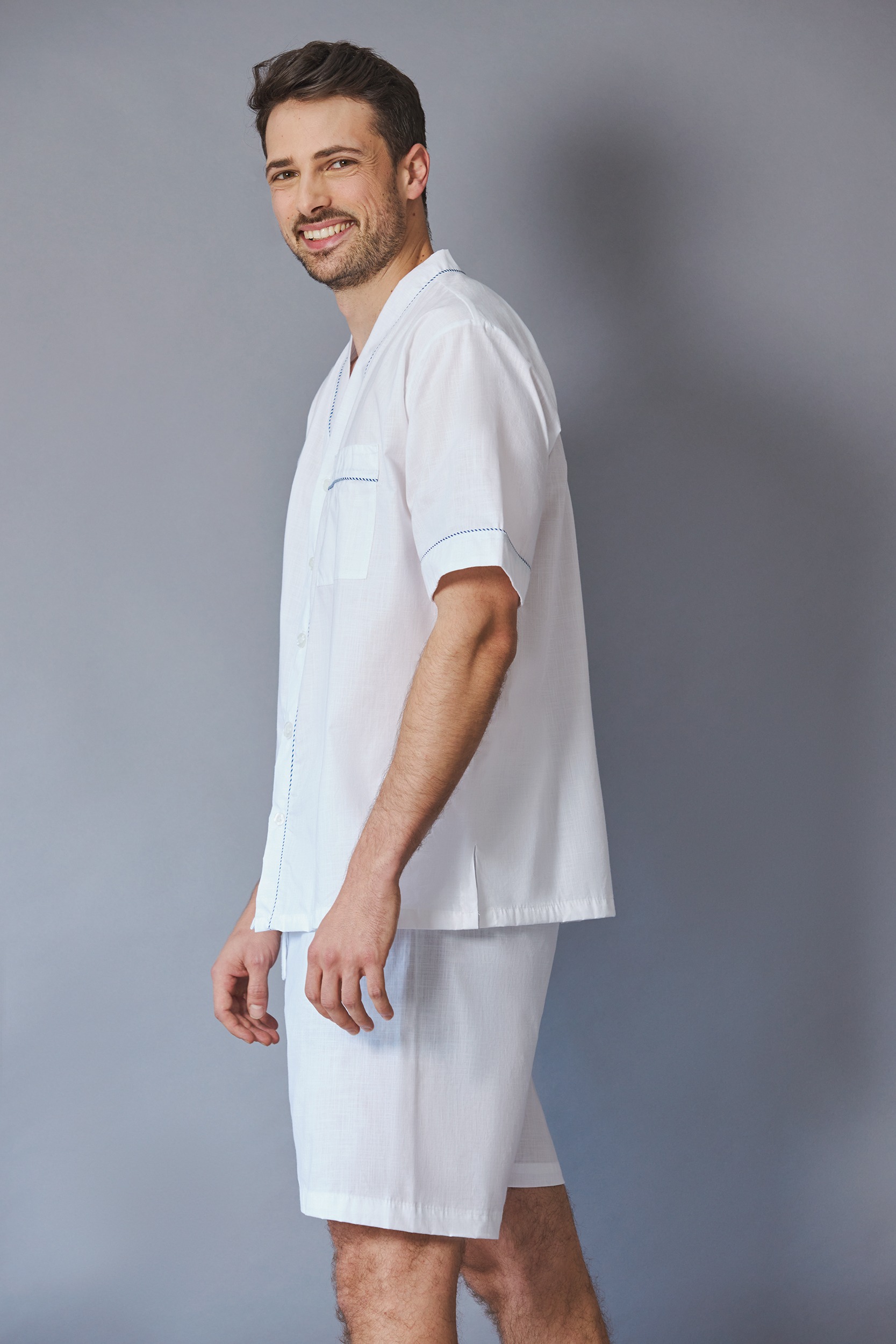 PIJAMA ELABORADA EN TELA 100% ALGODÓN EN TEXTURA TIPO LINO, DE GRAN SUAVIDAD Y FRESCURA