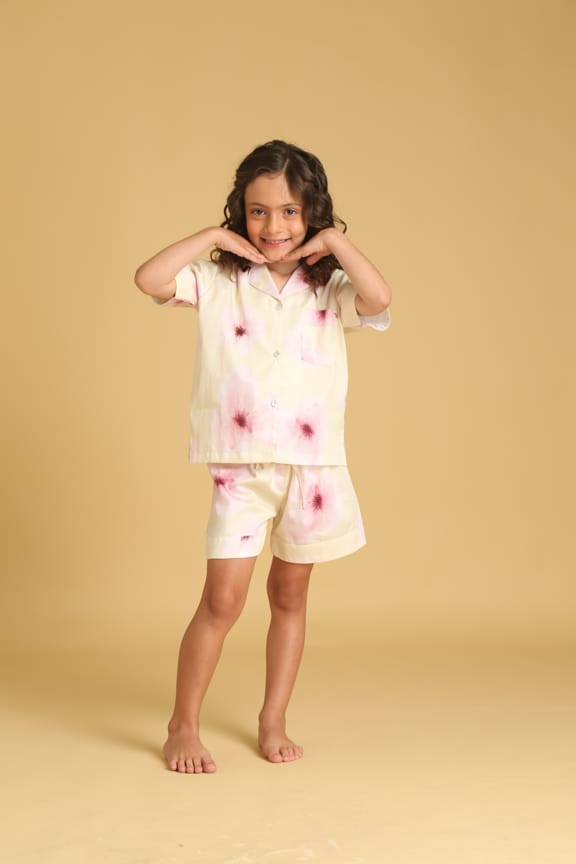 Pijama elaborada en tejido plano 100% algodón estampado en fondo vainilla con flores de tonos rodados. camisa de corte recto con manga corta, cuello con solapa y bolsillo del lado izquierdo. prenda inferior con elástico en la parte trasera de la cintura y ajustable al frente con cordones elaborados en la misma tela.