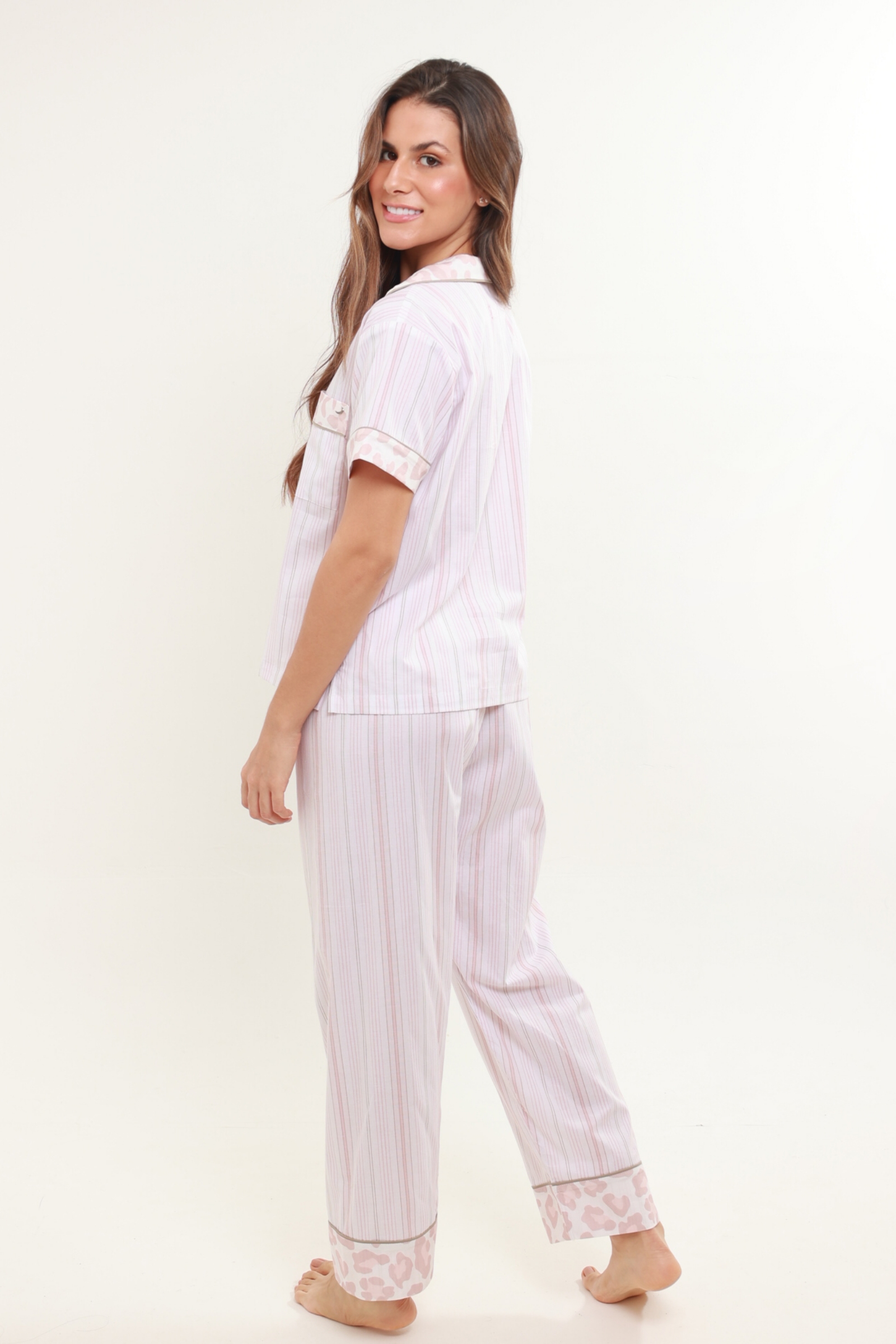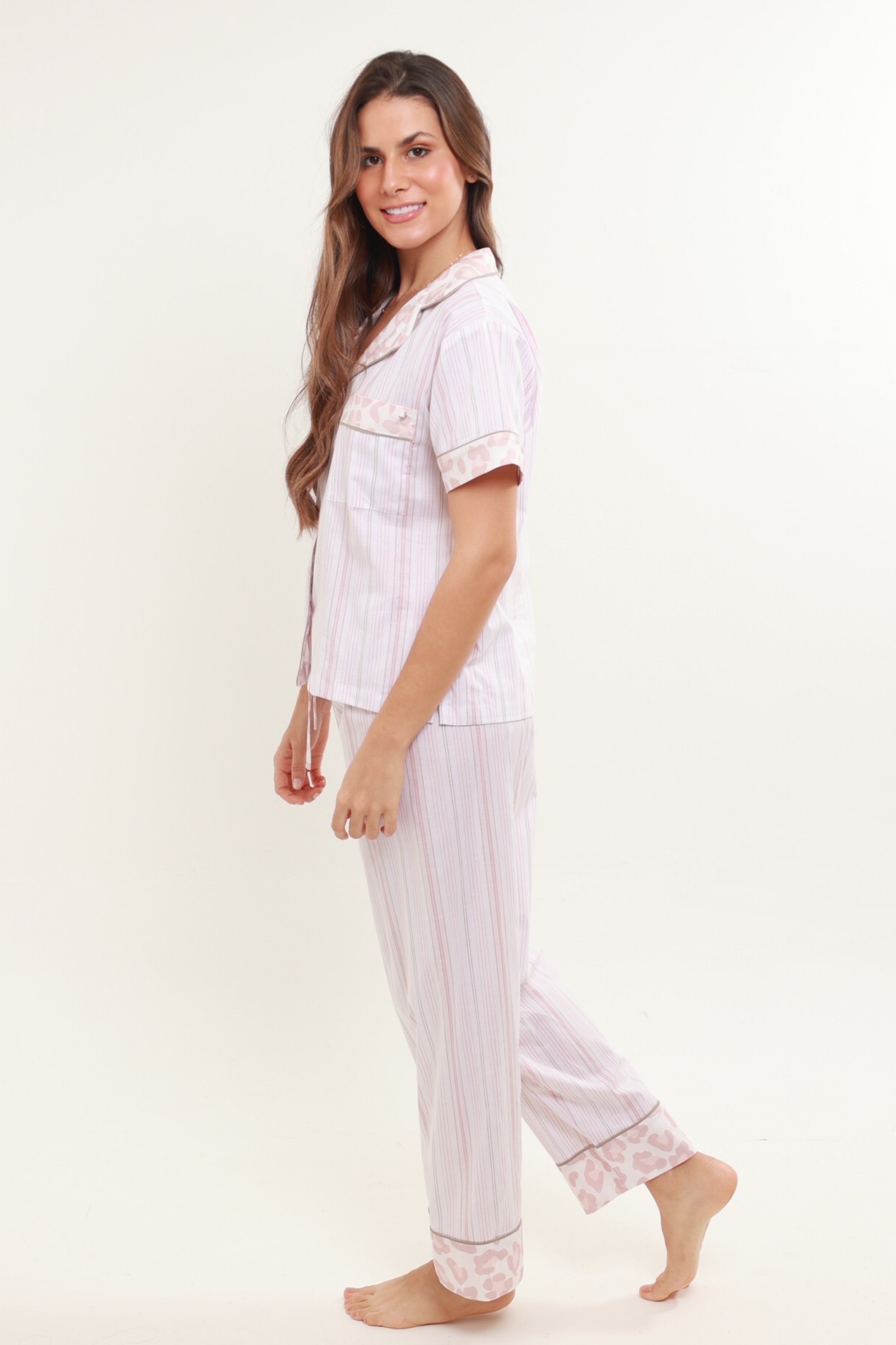 PIJAMA ELABORADA EN TELA 100% DE ALGODÓN CON DELICADO ESTAMPADO DE RAYAS Y DETALLES EN ANIMAL PRINT TONOS ROSA, DE TEXTURA MUY SUAVE Y LIVIANA. INCLUYE CAMISA DE CORTE RECTO CON CUELLO, MANGA CORTA Y BOLSILLO SUPERIOR IZQUIERDO/ PANTALON DE CINTURA AJUSTABLE CON CORDONES EN LA MISMA TELA Y BORDE INFERIOR COMBINADO.
